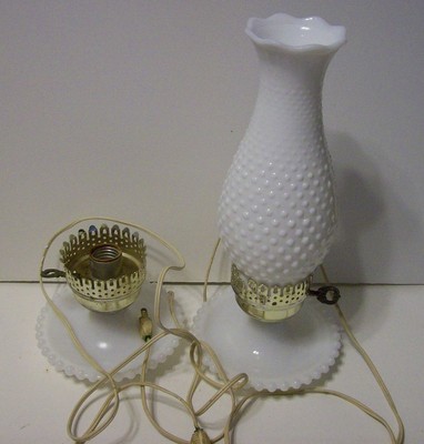Title (ebay affiliate link): 2- VINTAGE White Milk Glass Hobnail Hurricane Table Lamps 1 with globe & 1 w/o