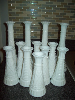 Title (ebay affiliate link): 12 VINTAGE WHITE MILK GLASS STARS AND BARS BUD VASES-WEDDING/PARTIES