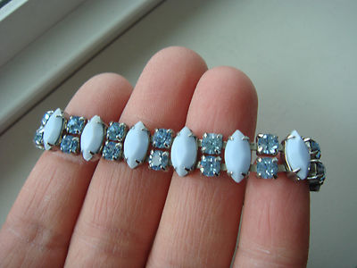 Vintage Signed WEISS blue Marquis Milk Glass Blue Rhinestone Prong Set Bracelet