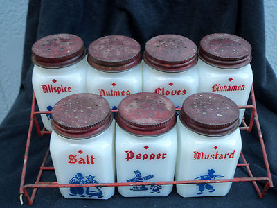 vintage milk glass spice jars in metal rack,royal scarlet,dutch scenes