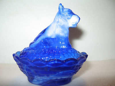 Title (ebay affiliate link): blue and white milk slag glass scottie dog salt cellar on nest basket dip cobalt