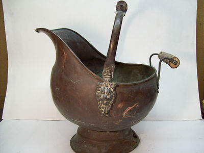 VINTAGE 12" TALL COPPER POT WITH BRASS EMBLEMS WOOD HANDLES