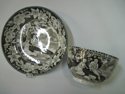 ANTIQUE BROWN TRANSFERWARE SOFT PASTE SCENIC CUP & SAUCER (1 OF 4)