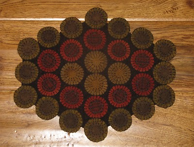 Title (ebay affiliate link): Primitive Wool Penny Rug ~ Handstitched ~ Browns, Greens, Rusty Reds