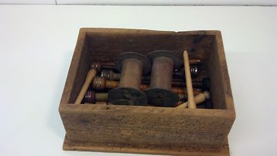 Title (ebay affiliate link): BOX MADE OF OLD WOOD WITH 23 SPOOLS,QUILLS &BOBBINS TEXTILE MILL