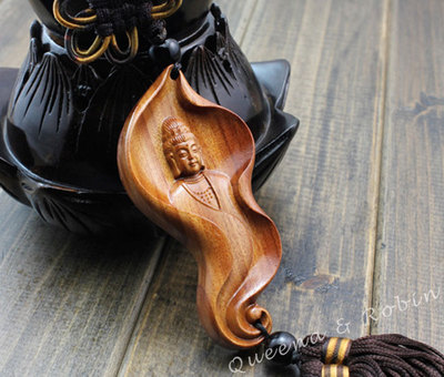 Wood carving & Chinese knot leaf Guanyin Bodhisattva statue sculpture amulet W38
