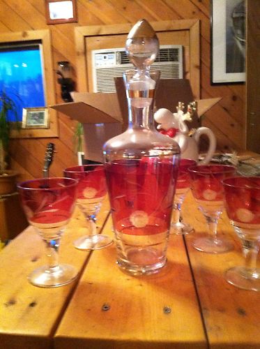 antique floral decanter with glasses