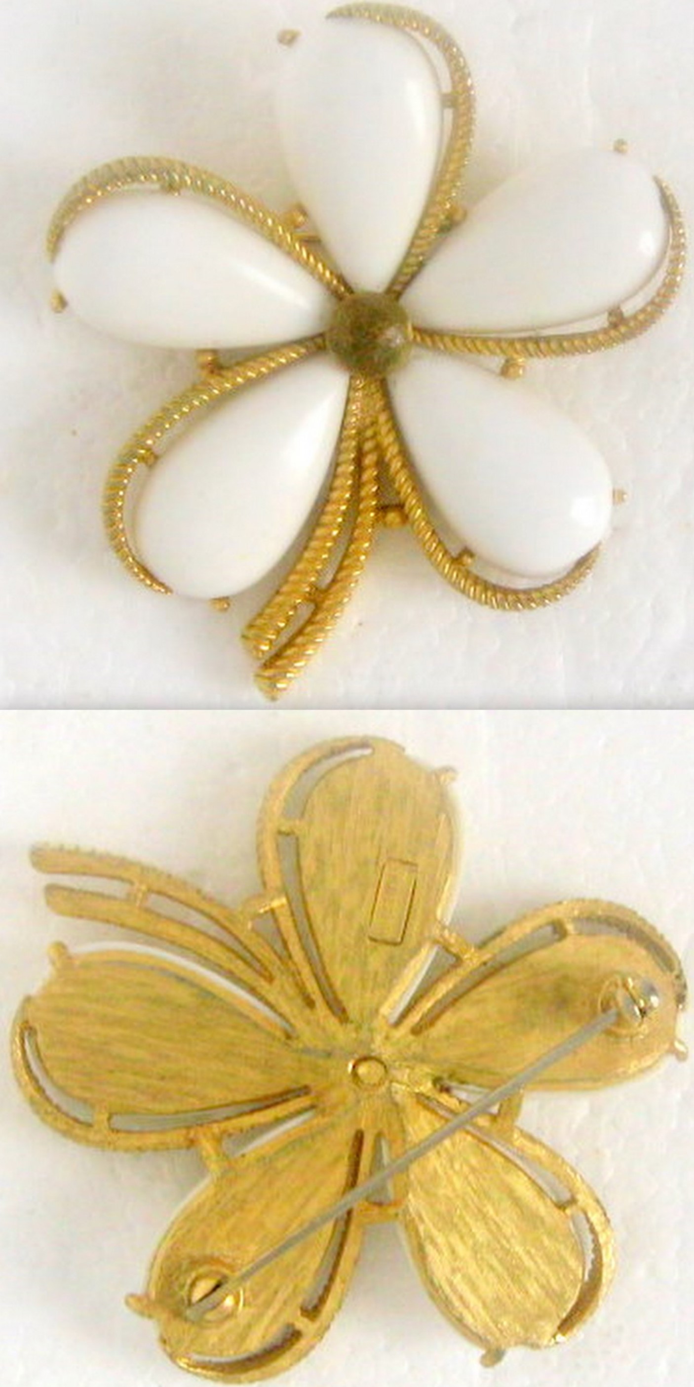 Vtg Crown Trifari White Milk Glass Gold Tone Flower Pin