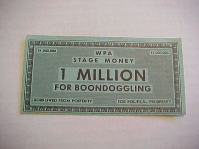 Title (ebay affiliate link): 1930'S WPA STAGE MONEY 1 MILLION FOR BOONDOGGLING ANTI-ROOSEVELT POLITICAL NOTE