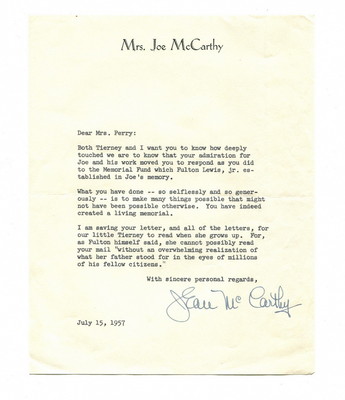 JOE McCARTHY: 1957 LETTER SIGNED BY WIFE; 3 PHOTOS; 1962 CLEAR HIS NAME LETTER,