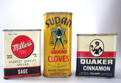 Title (ebay affiliate link): 3 Vintage Spice Tins~SUDAN Cloves, MILLAR'S Sage & QUAKER Cinnamon