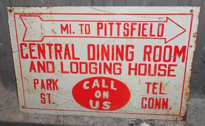 1910s/20's CENTRAL DINING ROOM & LOGGING HOUSE TIN SIGN ?MILES TO PITTSFIELD