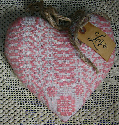 Title (ebay affiliate link): Primitive HEART Pillow Vintage Woven Coverlet Cupboard Heart Pillow Wallhanging
