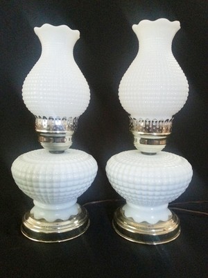 Title (ebay affiliate link): Vintage Pair of Milk Glass Hobnail Electric Faux Oil Lamp Table Lamps