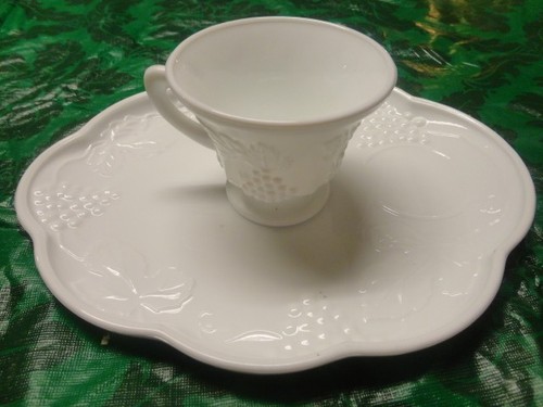 Title (ebay affiliate link): SET OF SIX WHITE MILK GLASS COLONY HARVEST GRAPE SNACK SET TRAY AND CUP