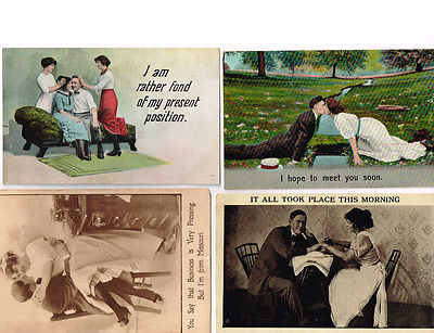 4 Card Lot, Comic/Romance, Kissing, Typewriter, Hold Heads, Goofy Look!! 1910!
