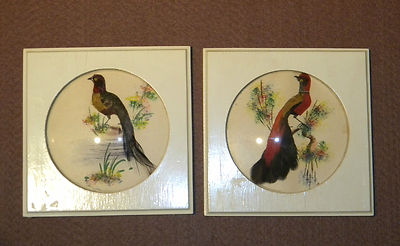Vintage 2 Framed Wall Pictures Art Painting & Feather Birds 50`s