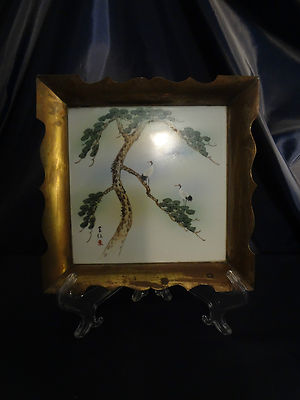 Title (ebay affiliate link): Rare Signed Japanese Hand Painted Porcelain Tile Mortared In Brass Frame Crane
