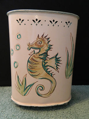 VINTAGE 1950s PINK DETECTO METAL WASTE BASKET ~ TOLEWARE SEA HORSE ~ NAUTICAL