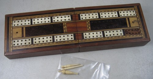 Antique c1900 Inlaid Wood & Bone Cribbage Board Box with Pegs