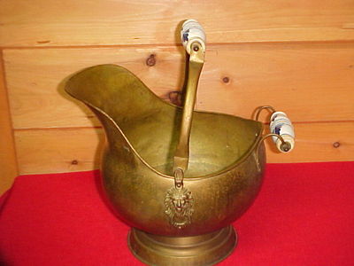 Title (ebay affiliate link): Vintage Large Brass Coal Fireplace Scuttle Bucket Ash ~Delft Handle ~ Lions Head