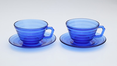 Title (ebay affiliate link): Hazel Atlas Moderntone Cobalt Depression Glass 2 Cup and Saucer Sets