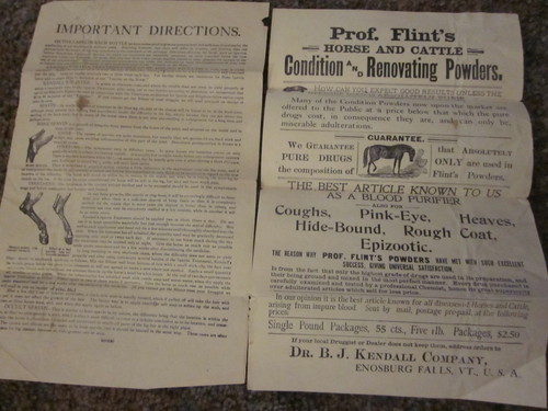 Title (ebay affiliate link): Antique Paper Prof. Flint's Horse Powders Dr. B.J. Kendall Enosburg Falls VT.