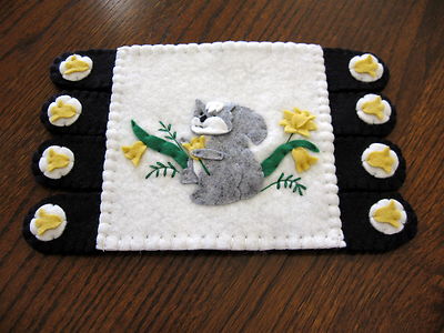 Title (ebay affiliate link): "Lil Squirrel in the Daffodil Garden" ~ Penny Rug ~ Candle Mat ~ Woolfelt Prim