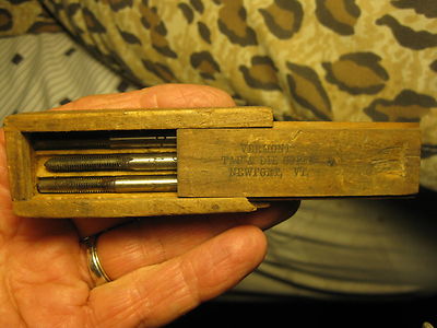 Title (ebay affiliate link): Vintage 3" VERMONT Tap & Dye Corp Newport VT Slide Lid WOOD BOX & 3 Vermont Tool