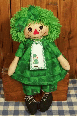 Title (ebay affiliate link): Handmade Irish Raggedy Ann Doll w GREEN HAIR ST Patricks Day Shamrocks