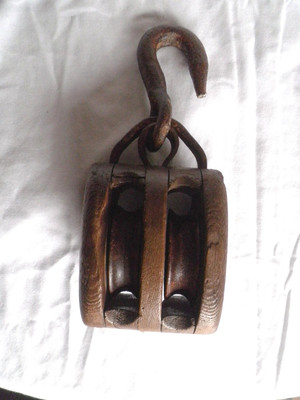 Title (ebay affiliate link): Antique Wood & Forged Iron Hook-Steampunk Wheel Pulley