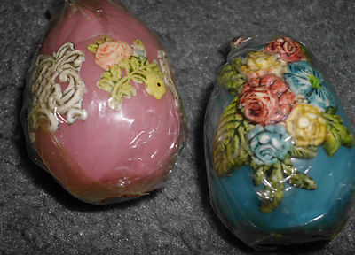 TWO VINTAGE PINK & BLUE EASTER WAX EGG CANDLES W/FLORAL DESIGN W GERMANY