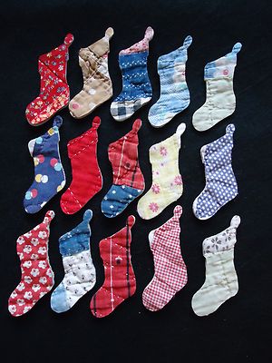 Title (ebay affiliate link): 15 PRIMITIVE ANTIQUE CUTTER QUILT CHRISTMAS MINI SANTA STOCKINGS
