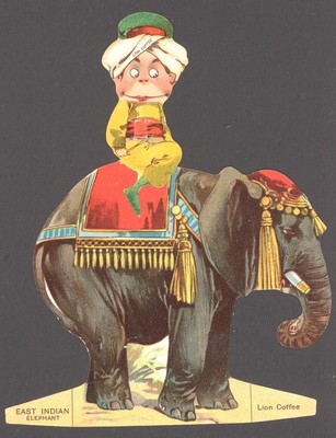 Title (ebay affiliate link): 1890s Palmer Cox Brownie Paper Doll ~ Lion Coffee Trade Card ~ Indian Elephant