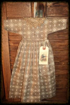 GRUNGY PRIMITIVE WALL~CUPBOARD DOLL DRESS TAN PATTERNED EASTER~FOLK~DECOR