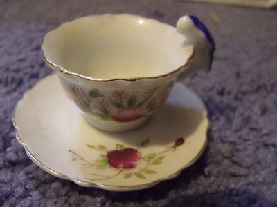 Miniature 1" Cup and 2" Saucer Set Japan Parrot Bird HANDLE Flower GOLD TRIM