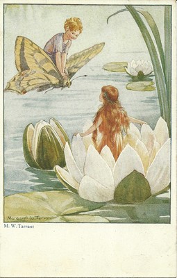 Title (ebay affiliate link): Margaret Tarrant. Fairy children in waterlilies & flying on butterfly