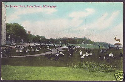 Vintage PC Stag Statue, lakeside picnic, Juneau Park, Milwaukee, Wisc, c1910