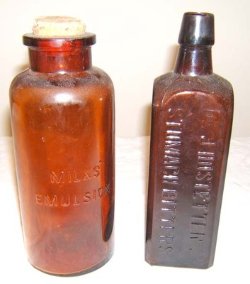 2 Old amber glass bottles Milks Emulsion Hostetter Stomach Bitters antique