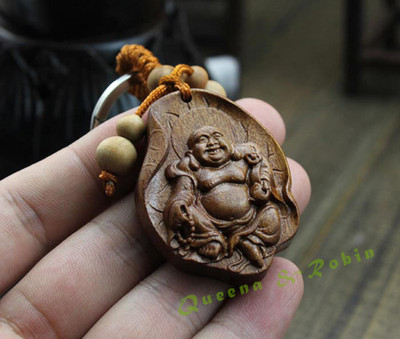 Title (ebay affiliate link): Chinese wood hand carved Leaf Laugh Maitreya Buddha amulet statue key chain W124