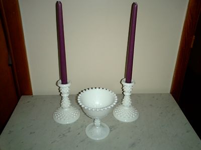 Title (ebay affiliate link): 2 Fenton Milk White Hobnail Candlesticks Candle Holders and Candy dish