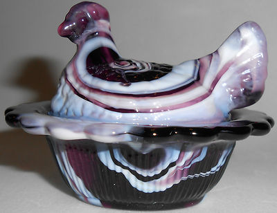 Amethyst and milk slag glass salt cellar hen chicken on nest basket dish purple