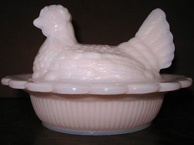 Title (ebay affiliate link): Pink milk glass hen chicken on nest basket dish rooster crown tuscan chick eggs
