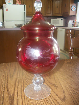 Title (ebay affiliate link): Vintage Ruby Red Flash Etched Apothecary/Candy Dish with Lid, Beautiful Jar