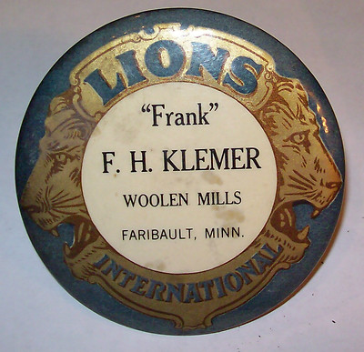 VINTAGE LIONS FRATERNITY CELLULOID LARGE BUTTON WOOLEN MILLS FARIBAULT, MN