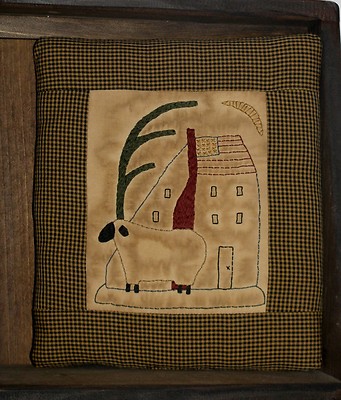 Title (ebay affiliate link): Primitive Stitchery Pillow w/Borders ~ Saltbox House, Sheep and Willow Tree