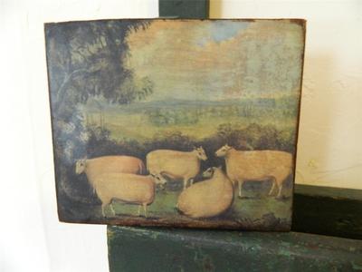 Title (ebay affiliate link): Primitive Print on Wood of Five Sheep in a Pasture