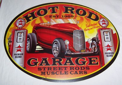 Title (ebay affiliate link): Hot Rod Vintage Metal Sign Muscle Cars Chevy Coupe Gas Station Auto Shop Garage