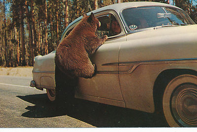 Title (ebay affiliate link): Bear Cubs Begging for Food from Car, Yellowstone Park, WY. c-1950 postcard.