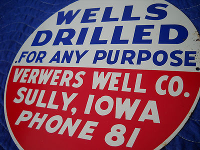Title (ebay affiliate link): c. 1930s WELL DRILLING 12" ROUND METAL SIGN w/ 2-DIGIT PH. # Sully Iowa oil NOS